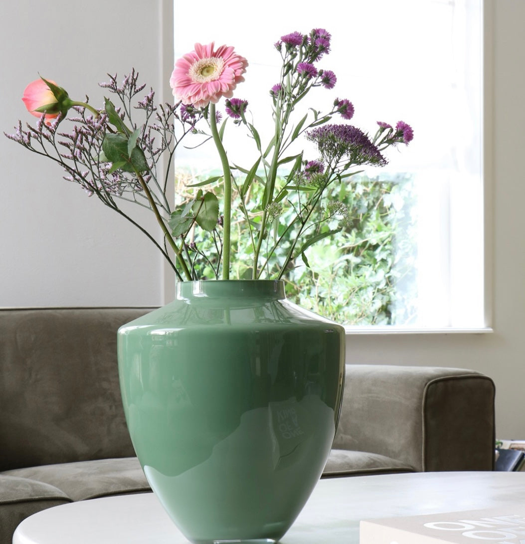 Deze groene vaas is perfect voor bijna ieder interieur, en leuk te combineren met een groot boeket! Een keer wat anders met deze prachtige groene kleur.